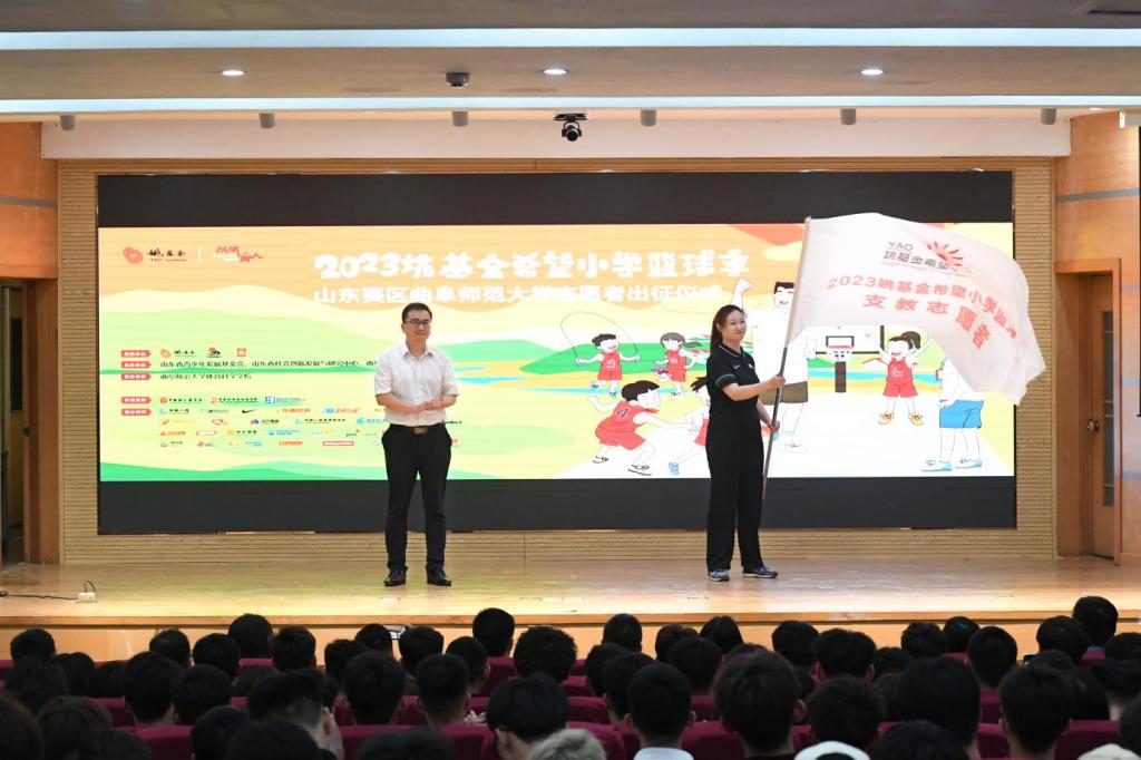 山东省青少年发展基金会资助部部长董晓峰为志愿者代表李柯阳授姚基金希望小学篮球季旗,曲阜师范大学团委书记孔轶众为志愿者代表马蔓妮授姚基金希望小学篮球季支教志愿者旗。