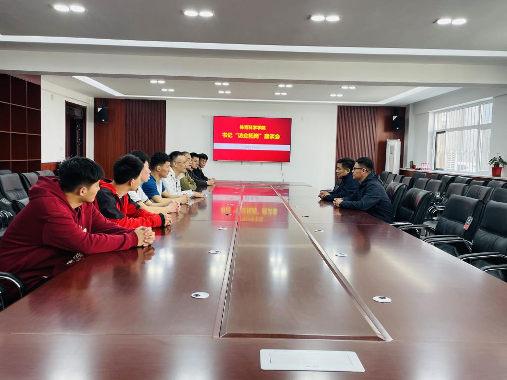 会议室开展书记“访企拓岗”促就业专项座谈会。山东魏桥创业集团有限公司代表、体育学部党委书记刘敏、毕业班辅导员唐海峰和学生代表参加座谈会。