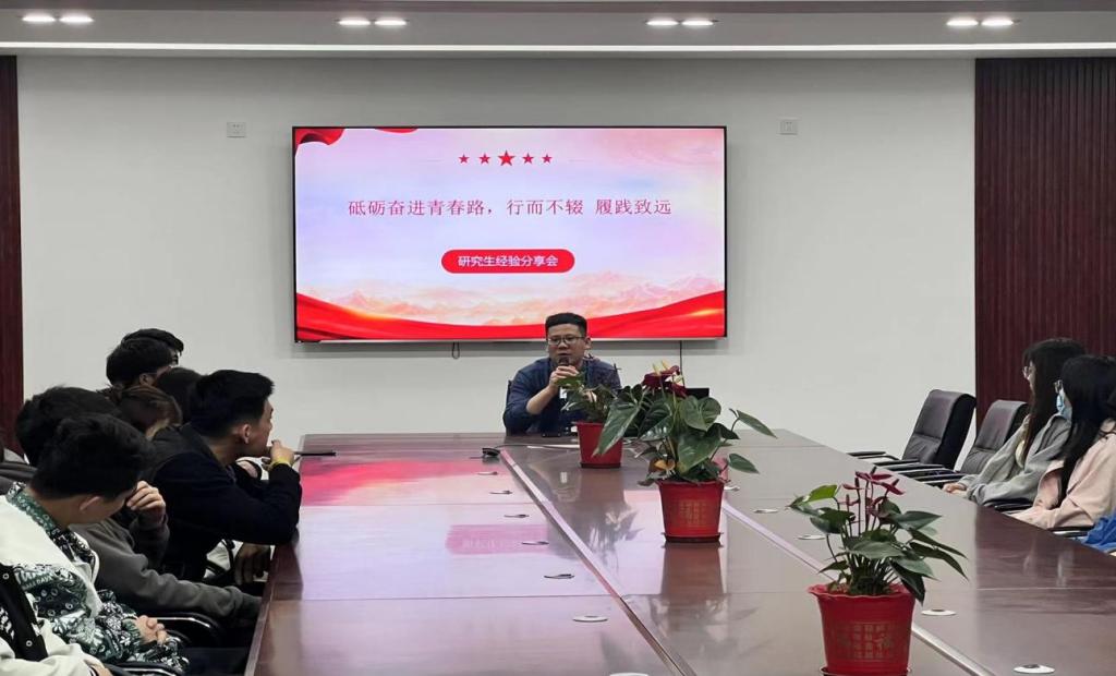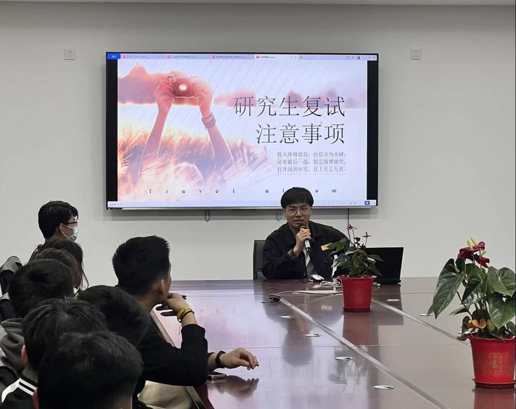 系楼会议室召开研究生考研复试经验分享会议,本次交流会邀请上届考研中成绩优异、经验丰富的2022届师哥靳友客和郭志杰,本次会议由唐海峰老师主持。