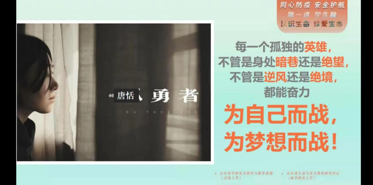 最后老师们对于珍爱生命、呵护生命给出了五条建议,要求我们要勇于接纳挫折、客观对待挫折、乐观对待挫折、全面看待挫折、树立生命底线思维。并以《孤勇者》的词作者唐恬战胜癌症的故事激励我们积极面对生活中出现的各种磨难,为自己而战,为梦想而战!