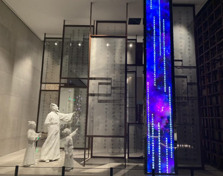 孔子博物馆的展设以“孔子的时代、孔子的一生、孔子的智慧、孔子与中华文明、孔子与世界文明、诗礼传家”六大部分构成展陈以文物为载体,以高科技为手段,运用互动式、体验式、沉浸式的形式,增强展览吸引力、感染力,将信息技术充分运用到展览中,以数字化设备立体生动地展现曲阜历史,打造出了以“君子之道”为主题的互动演绎空间,孔子圣迹图数字化长卷,通过和孔子对话,让全体师生身临其境的感受孔子的思想与智慧。