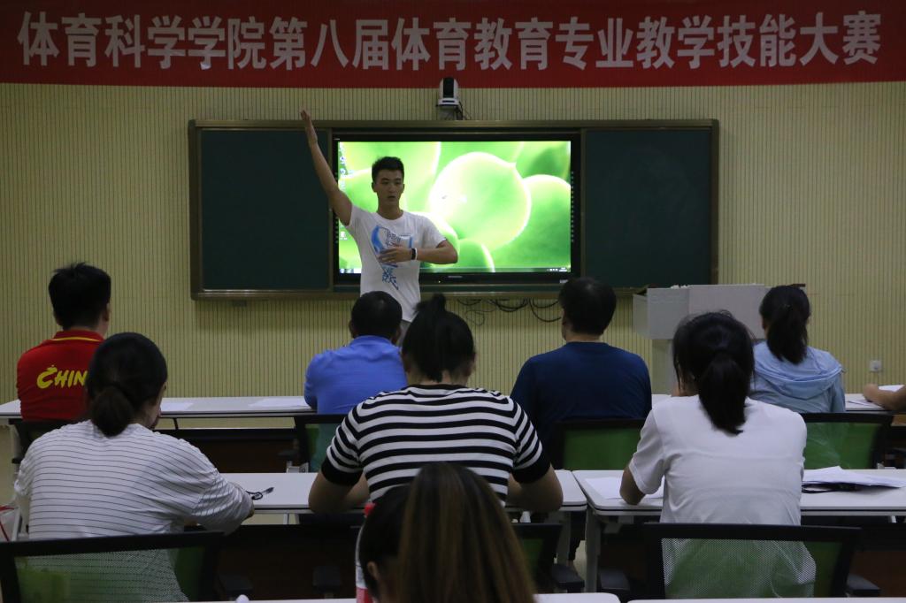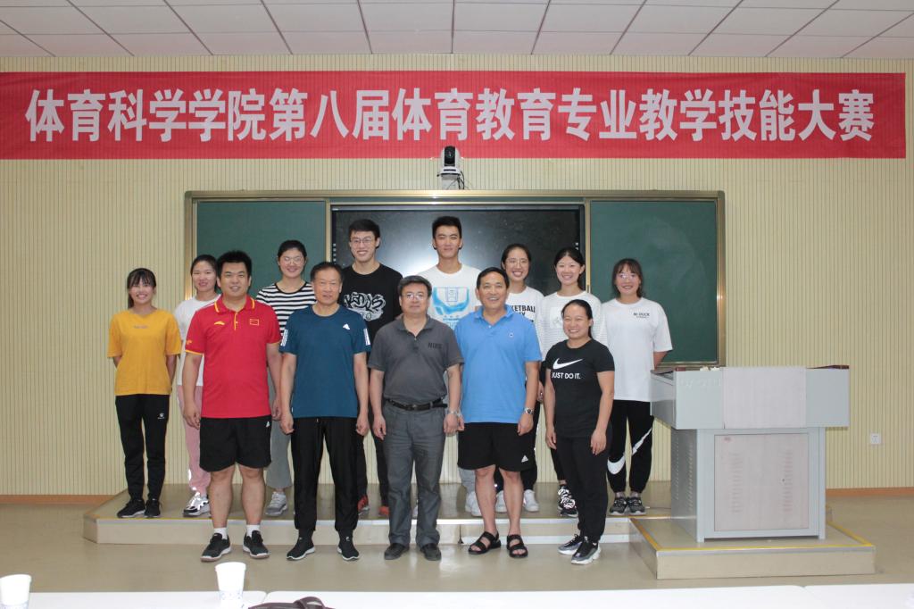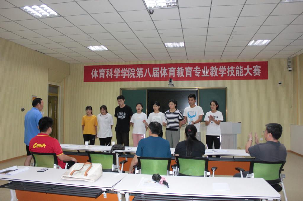 在院二楼录播室举办第八届体育教育专业教学技能大赛。比赛由副院长李思民主持,解毅飞教授、周全教授及优秀青年教师李峰、王欢、王晋担任评委。