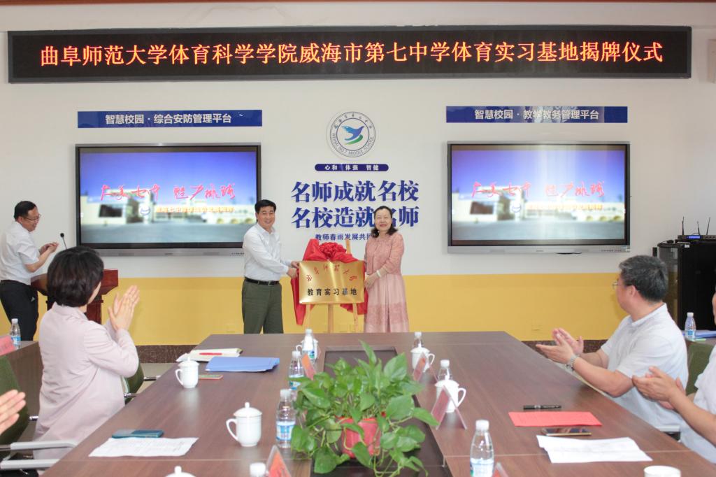院长曹莉教授与威海七中校长谷娥签署了教育实习基地协议,并与环翠区教体局局长公佩宏为实习基地揭牌。
