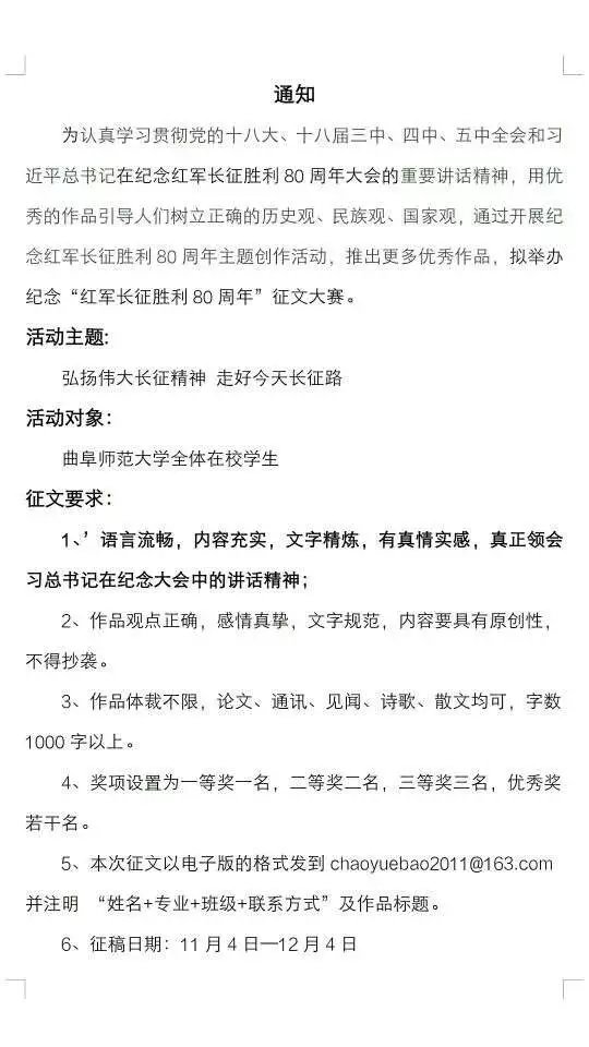 本次征文活动以“弘扬伟大长征精神,走好今天长征路”为主题,面向我校全体学生进行征文。征文要求语言流畅,内容充实,文字精炼,有真情实感,真正领会习近平总书记在纪念大会中的讲话精神;同时需要感情真挚,文字规范,内容要具有原创性,不得抄袭,并且对作品的体裁不限,论文、通讯、见闻、诗歌、散文均可来稿,字数要求1000字以上。本次征文活动截止到 12月 4日,活动最后将会评选出一等奖一名,二等奖二名,三等奖三名,优秀奖若干名。