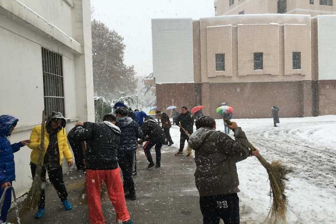 党总支副书记展利民、团总支书记赵峰、辅导员老师梁贺涵和同学们冒着严寒,拿起清扫工具奋力清理积雪。持续飘洒的雪花,凛冽的北风,增加了除雪的难度。师生们的手和脸都冻得通红,身上披着一层雪花,头发被雪水和汗水浸湿,但这丝毫没有影响大家的工作热情和效率。师生们团结协作,经过三个多小时的奋战,体育楼前至田径场、楼东侧的人行道积雪已被清理干净。25日上午,展书记、赵书记和梁老师又带领同学们将学校划分的卫生区积雪清理干净。