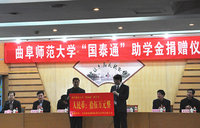 杰出校友孙国成先生为母校莘莘学子慷慨解囊,在我校成立“国泰通”助学金。3月19日下午2:00,曲阜师范大学“国泰通”助学金捐赠仪式在我校孔子会堂隆重举行。出席捐赠仪式的有校友孙国成,学校副校长扈庆学,学校办公室主任夏云杰,学校学生工作处处长杨永明,学校团委书记屈跃宽,学校招生就业处副处长杨东,我院党总支书记荆兆清,副书记展利民,团总支书记赵峰,辅导员李娜。本次会议由学校办公室主任夏云杰主持,副校长扈庆学、青岛国泰通国际货运代理有限公司董事长、8波足球比分