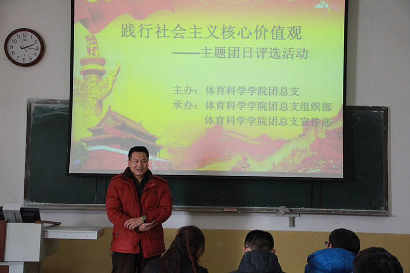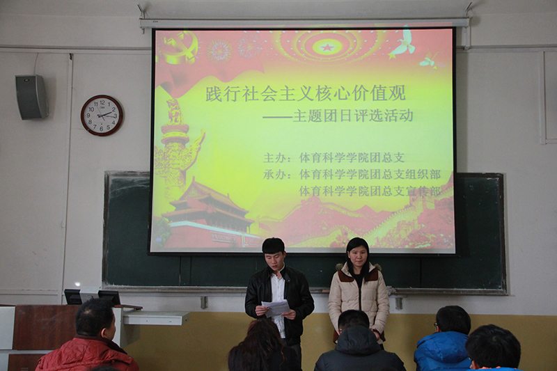 活动开始,由赵峰讲述社会主义核心价值观的内容和精神实质。其后各班团支书通过PPT分享团支部对社会主义核心价值体系的理解,各团支部通过一系列的活动积极践行社会主义核心价值观,趣味运动会、辩论赛、排球比赛、敬老院献爱心、观看关南京大屠杀视频等丰富精彩的活动诠释了同学们对社会主义核心价值观的理解和认同。