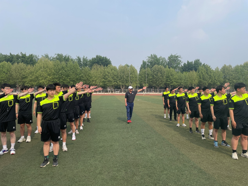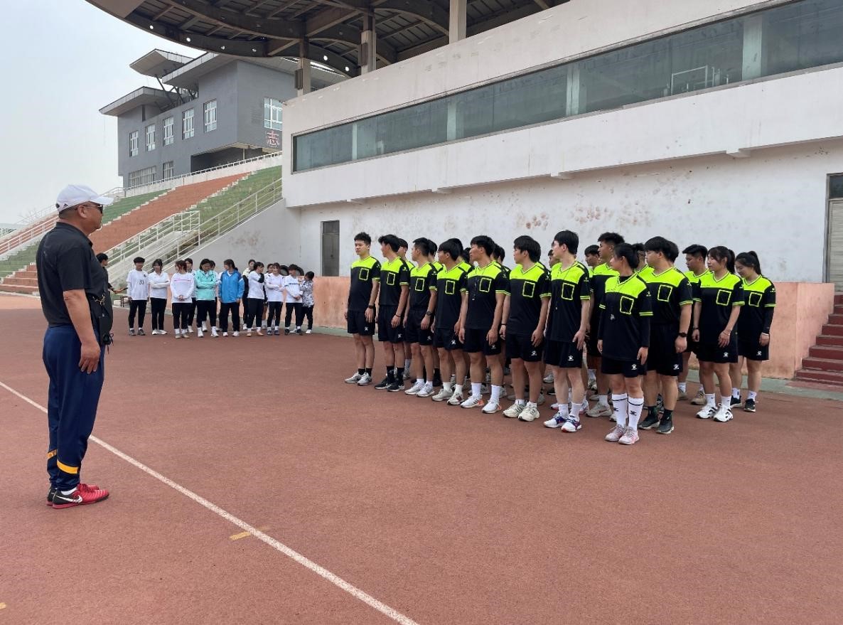 除理论学习外,培训班还安排教学实践环节。在裁判讲师的带领下,学员们来到学校的足球场进行实地演练。互相学习、共同进步,不仅提高了裁判员哨音和旗示的熟练度,也增强了“四位一体”的团队合作意识。