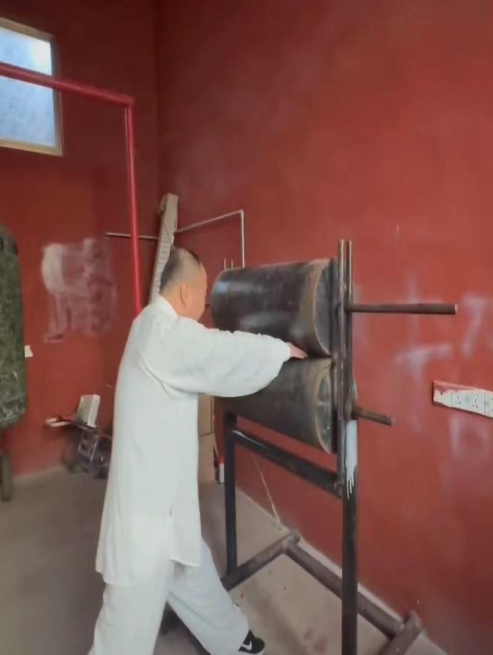 然而在感叹佛汉拳这一伟大的文化传承时,张继民老师道出了佛汉拳的练习应从童子功开始练起:冬练三九夏练三伏,日复一日,年复一年。在这几十年内从未间断。随后张继民老师带实践队员们参观了佛汉平常的练习器械,以练习铁手功的器械的磨盘,滚筒(由两个铁筒上下组合而成下方铁筒固定不动上方铁筒可转动和上下移动)等自制的练习器械。以滚桶为例正常的使用方法:将手插入再拔出。一个滚筒重量高达四十公斤。