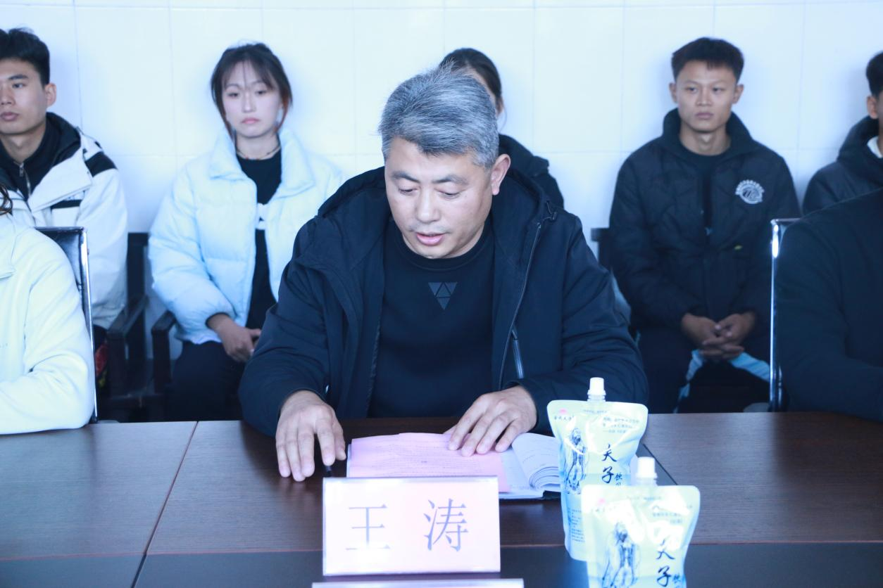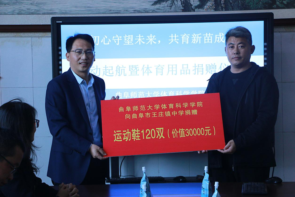 向王庄镇中学捐赠运动鞋120双,王庄镇中学校长王涛代表学校接受了捐赠。