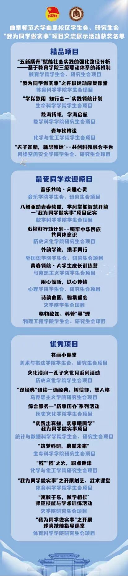 (通讯员:张欣怡)在曲阜师范大学校团委开展的全校研究生会和本科学生会“我为同学做实事”项目交流展示活动中,经风采展示、现场答辩、评委评审,共产生了6个“精品项目”, 8个“最受同学欢迎项目”以及10个“优秀项目”。其中,8波足球比分