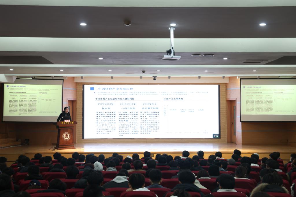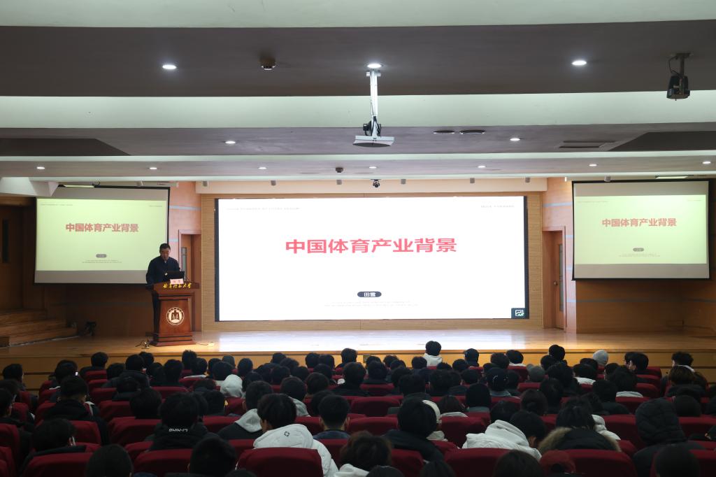 随后,田雪以“中国体育产业背景”为主题,展开了深入的报告。会中,田雪结合马斯洛需求理论,对中国体育产业的驱动力、规模、结构进行了全方位的分析,并进一步探讨了体育产业市场的多个方面。她特别提到了同学们普遍关心的创新创业问题,针对运动装备、体育场地、体育赛事运营等赛道进行了详细分析,就同学们的疑问进行了耐心解答。