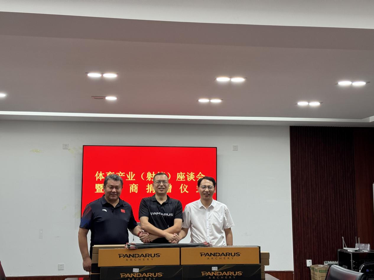 随后,捐赠仪式正式举行。捐赠方代表将崭新的反曲弓、教学木弓、护臂、护指、训练器等价值约5万元射箭器具移交8波比分