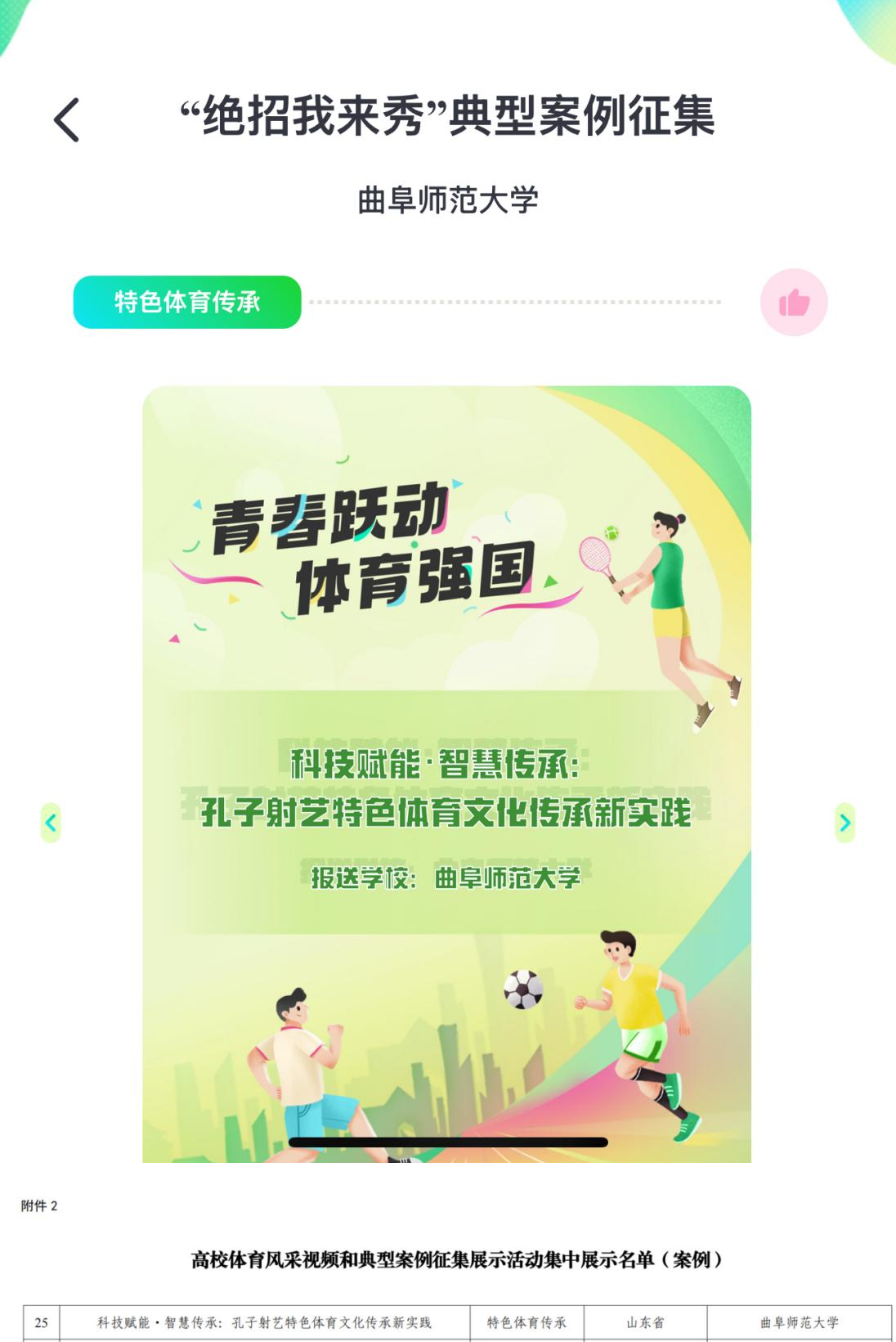 报送的“科技赋能・智慧传承:孔子射艺特色体育文化传承新实践”入选,在“人民网+”客户端、人民日报少年客户端集中展示。