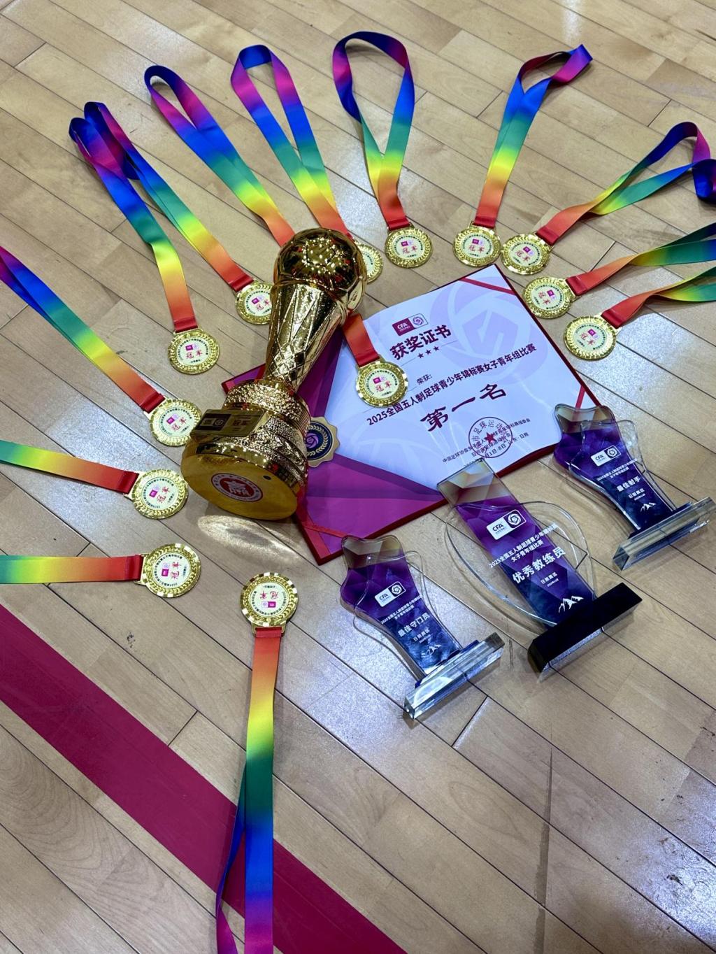 女子足球队一路过关斩将、奋勇拼搏,最终摘得桂冠,同时包揽最佳守门员陈晓乐、最佳射手谭新洁和王玲莹、优秀教练员崔静三项个人荣誉称号,为学校赢得了国家级赛事的荣誉勋章。