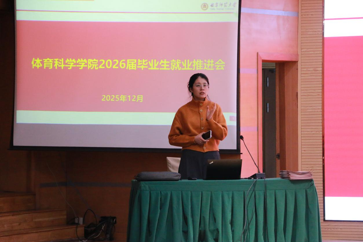 2026届毕业生的实际情况,从就业现状分析、求职方向梳理、就业服务计划三个方面展开专题分享。她首先通报了当前毕业生的就业意向摸排情况,分类梳理了考研升学、中小学体育教师招聘、体育企业运营、全民健身指导等主流就业方向的市场需求与竞争态势,重点指出部分学生存在职业定位模糊、求职准备不足、基层就业意愿不强等问题。随后,结合自身多年就业指导经验,围绕简历优化、面试技巧、政策利用等核心内容给出具体建议,表示要突出体育专业技能、教学实践经历等差异化优势,同时详细解读了基层就业、创新创业相关的扶持政策,鼓励毕业生把握机遇、多元择业。