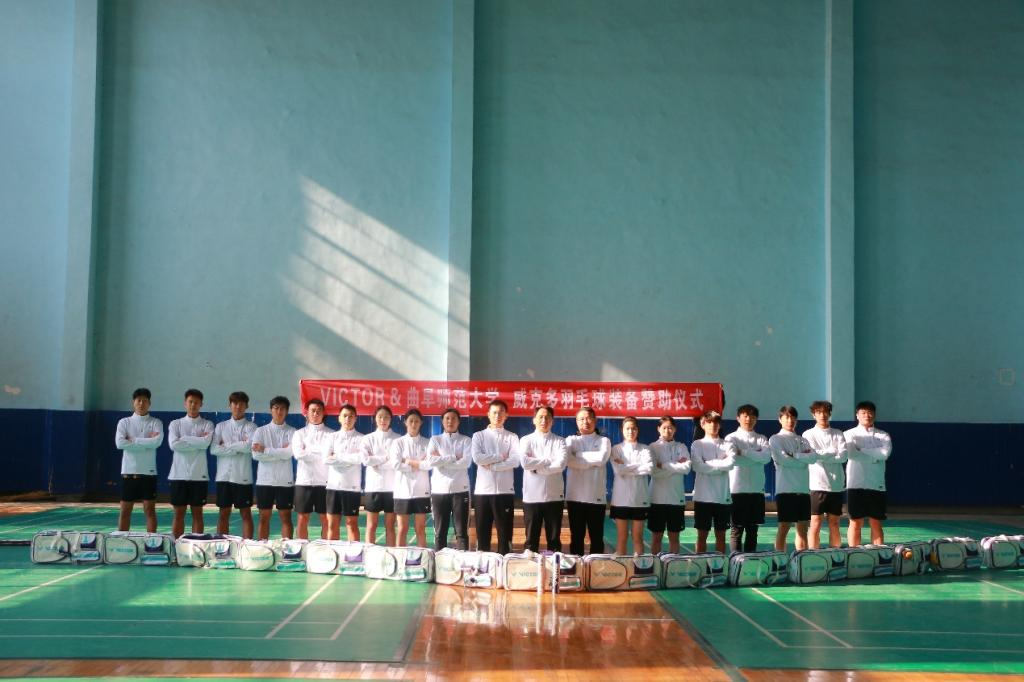 教师朱磊、周跃辉、许凤英、校羽毛球队全体队员及威克多品牌负责人共同出席仪式。