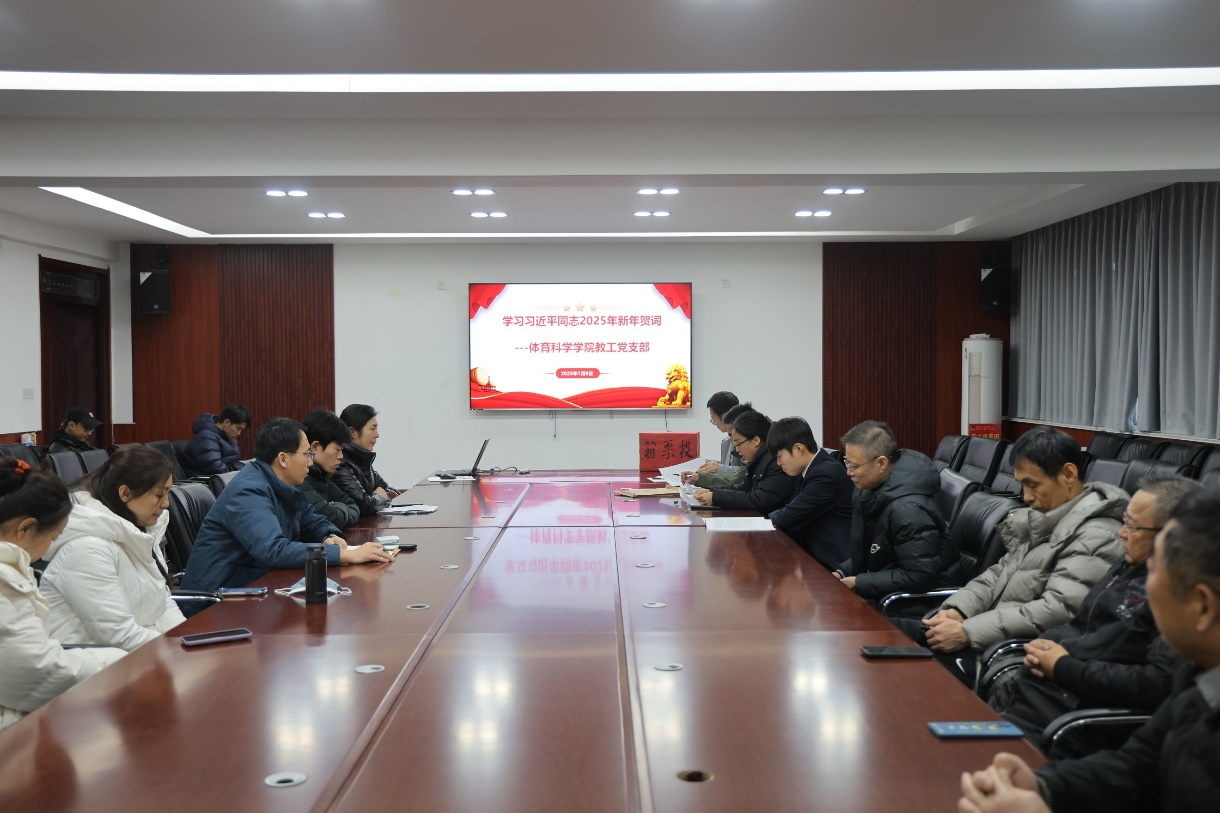 教工党支部召开会议,学习传达习近平主席2025年新年贺词,教工党支部书记许凤英主持会议,体育学部党委书记许怀祥出席会议。