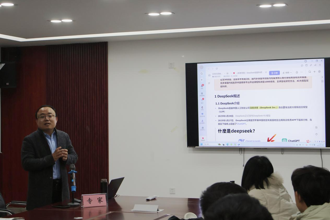 106会议室举办了杏坛体育大讲堂系列活动第二讲。本次讲座聚焦于“Deep Seek赋能科研的底层逻辑与经验分享”,邀请到了在知识组织与管理、AI赋能科研等领域具有深厚造诣的郭顺利副教授担任主讲人。